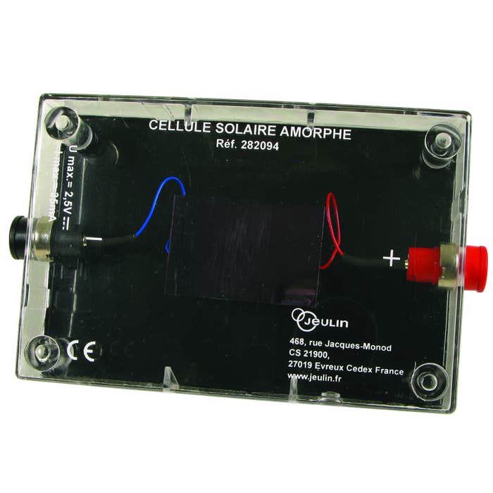 Cette cellule solaire amorphe (réf. 282094) est logée dans un boîtier transparent, permettant d’observer directement sa structure. Elle est protégée dans son boîtier et dispose de douilles sécurisées de 4 mm pour la connexion. Elle permet de tracer la courbe courant-tension et d’alimenter une charge pour évaluer la production d’énergie électrique.