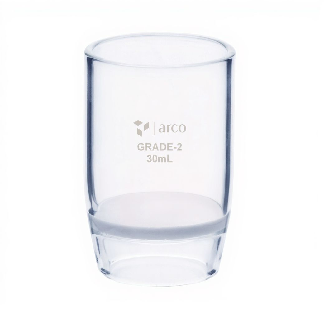 Creuset de filtration type Gooch en verre borosilicaté 3.3, capacité 30 mL, équipé d’un disque fritté G‑2 intégré pour la filtration fine. Idéal pour la séparation solide‑liquide en laboratoire et adapté aux applications analytiques et métallurgiques.