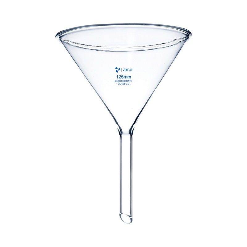 Entonnoir plain (sans robinet) à tige courte, diamètre 125 mm, fabriqué en verre borosilicaté 3.3 de qualité laboratoire, angle de cuve 60° pour un bon ajustement du papier filtre, conforme aux normes IS 1591 / DIN ISO 4798.