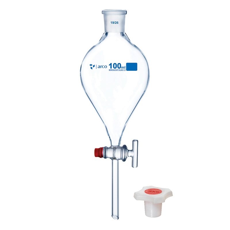 Entonnoir séparateur en verre borosilicaté 3.3 (forme poire), capacité 100 mL, équipé d’un bouchon en polypropylène (PP) et d’un robinet (stopcock) en verre, conforme à la norme ISO 4800.