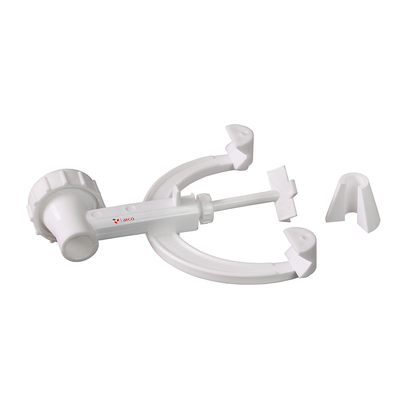 Pince à burette monobloc en polypropylène non‑corrosif et incassable. Le vérin central à ressort dissimulé assure une prise ferme de la burette sans gêner les graduations. Le support central comprend des cales coniques permettant une fixation solide sur des tiges jusqu’à Ø 12,5 mm. Référence catalogue 2070840/1.