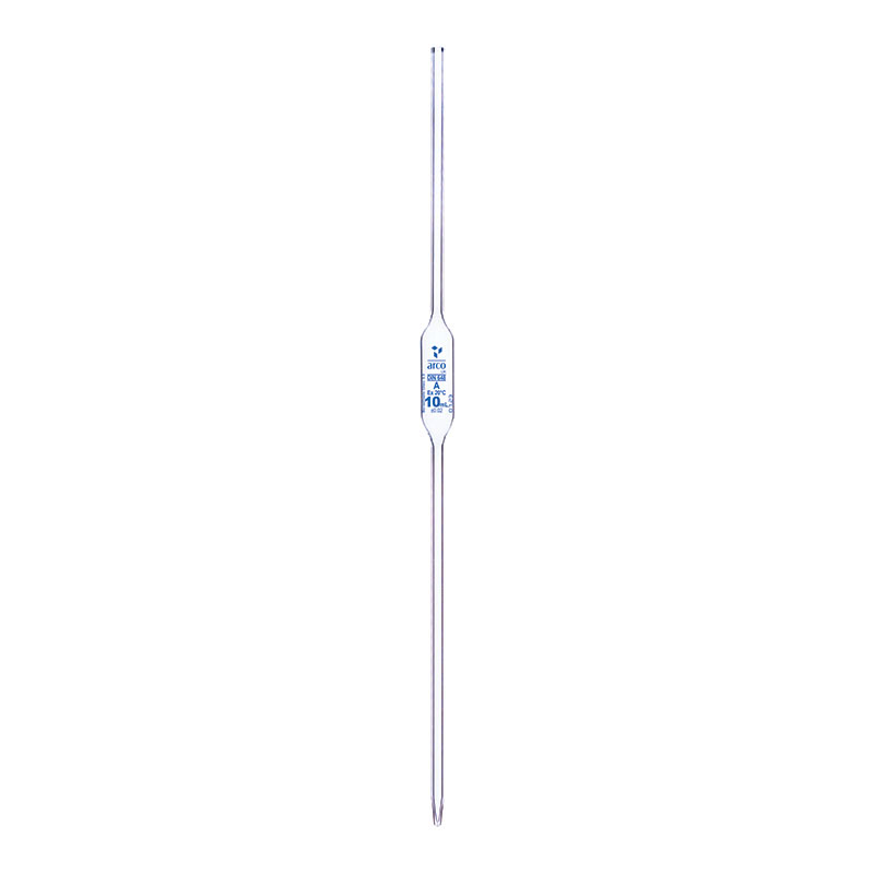 Pipette volumétrique à un trait (one‑mark), Classe A, capacité 10 mL, en verre borosilicaté. Calibrée pour délivrer un volume fixe avec grande précision, adaptée aux applications analytiques exigeantes.